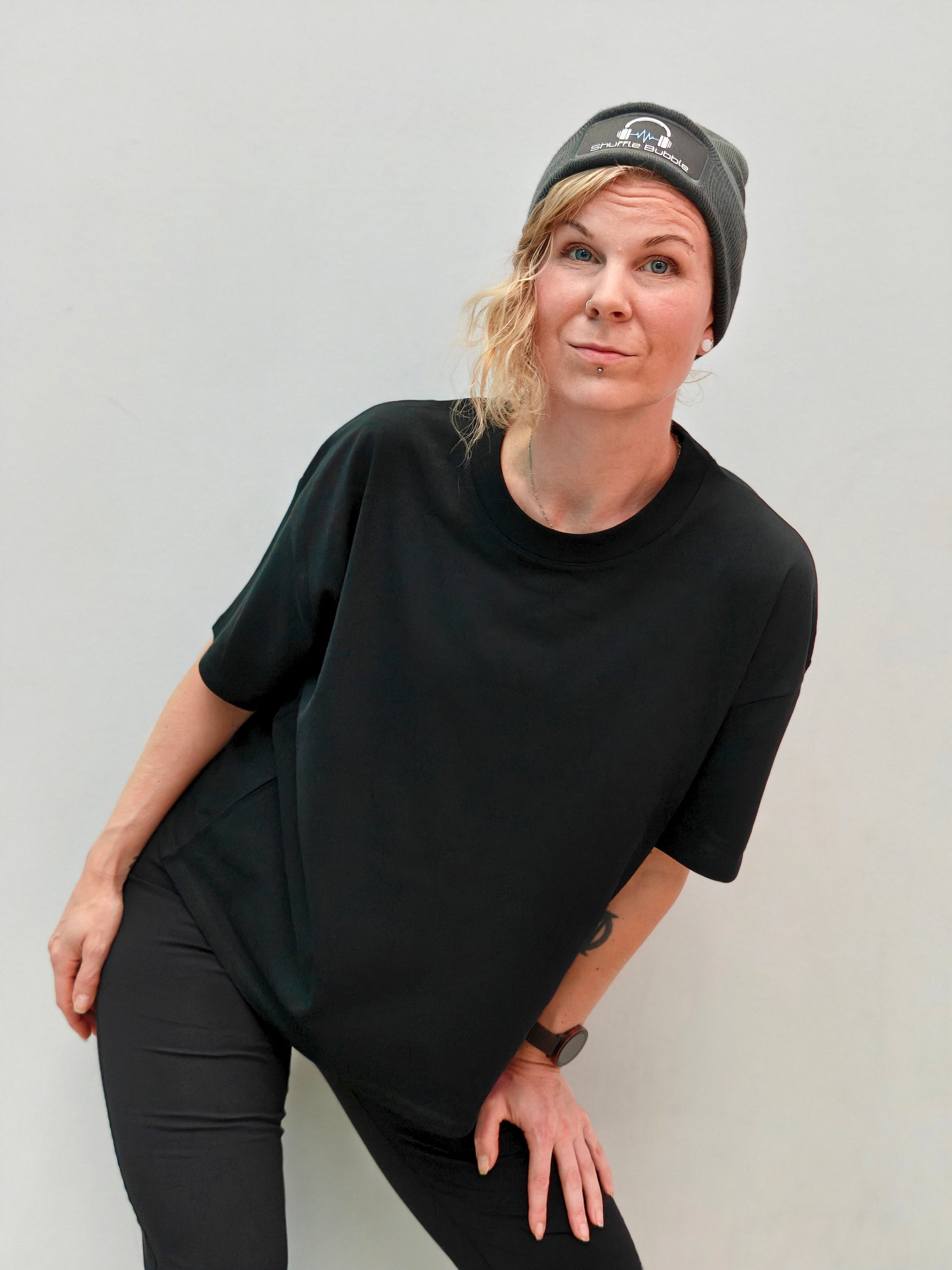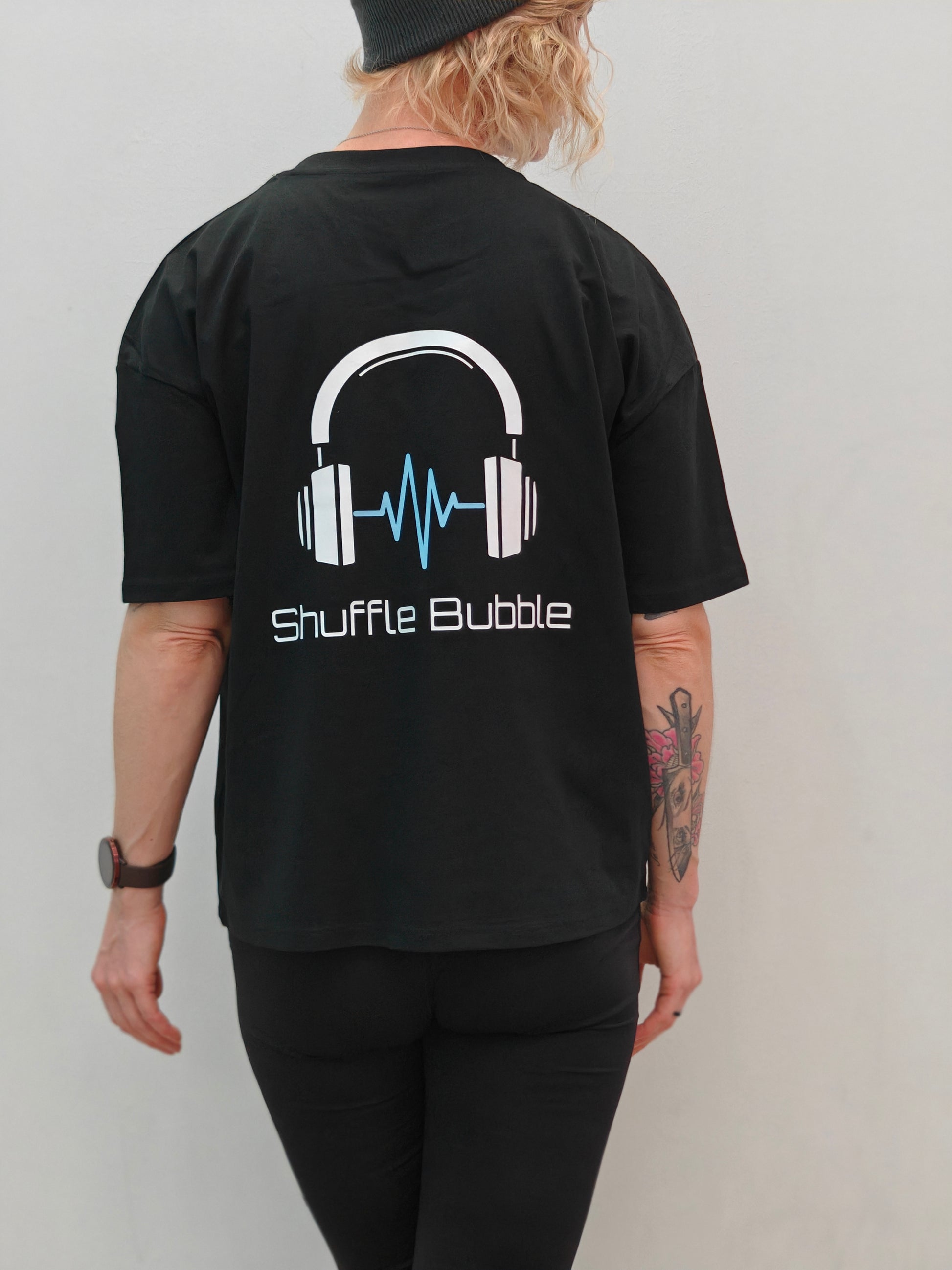 Oversize musta T-paita, lyhyt malli. Shuffle Bubble- painatus selässä.